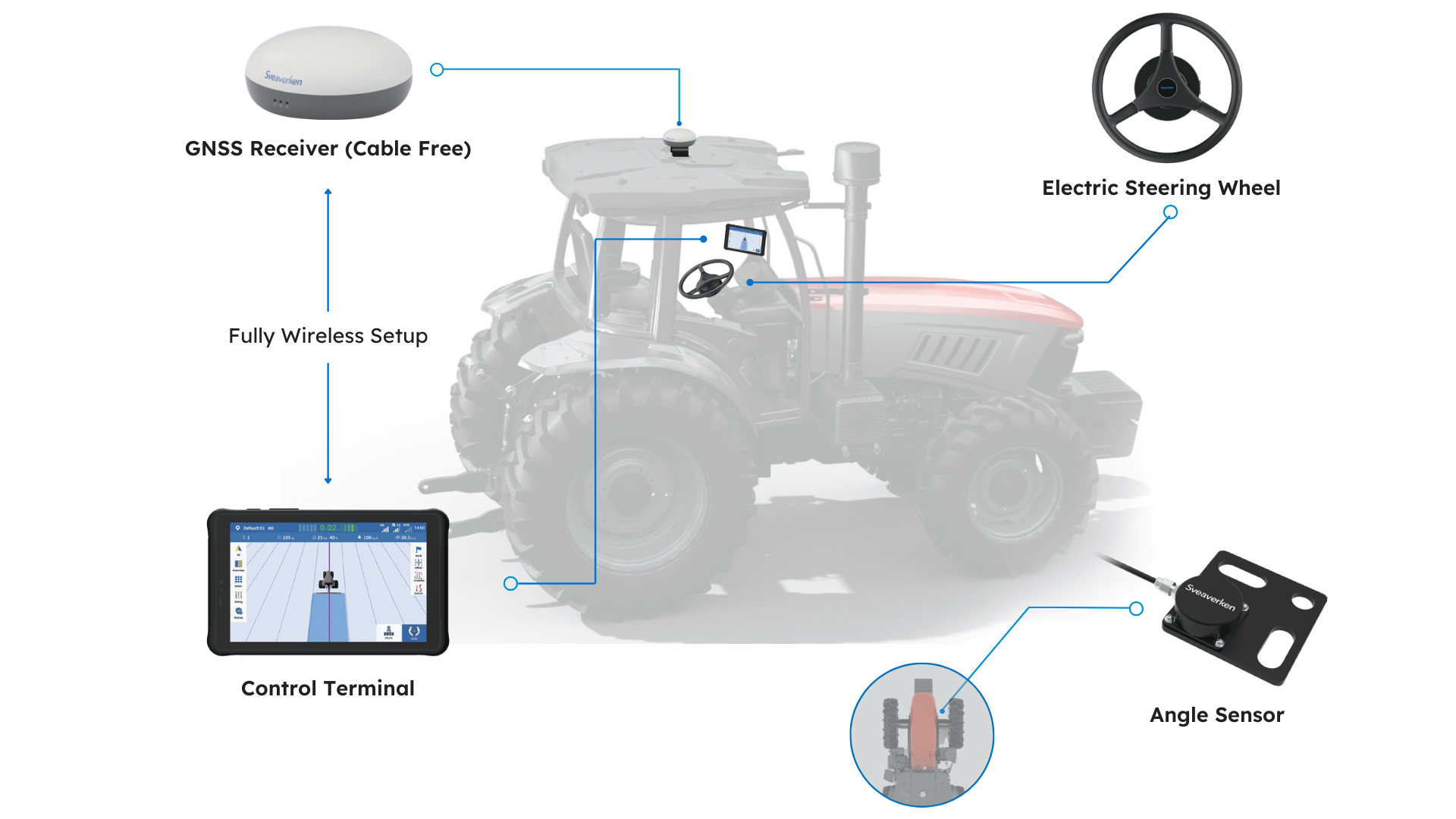 The F100C RTS Auto Steer System provides ±3cm accuracy in remote areas with poor signal and limited network coverage, operating without network or base station — enabling precise and efficient farming, even off the grid.